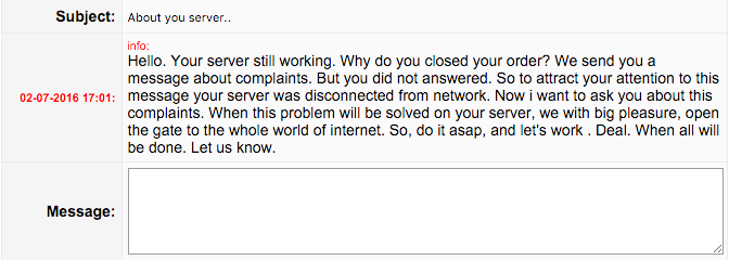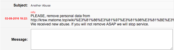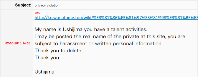 うしじまいい肉がwikiのサーバー管理会社に送ったメール。 サーバー管理会社から管理人に送られたメール。 サーバー管理会社から管理人に送られた二通目のメール。 2016年2月6日夜から8日朝にかけて唐澤貴洋wikiにアクセスできなくなる事態が発生した。原因は、うしじまいい肉がモルドバに所在する唐澤貴洋wikiのサーバー管理会社に送ったクレームのメールにより、サーバーが止められたためであることが復旧後にwiki管理人により開示された。なおうしじまいい肉から送られたメールの文面も同時に開示された。メールは英語で書かれていたが文法はかなり適当でありマングリッシュの再来と言われたが、Google翻訳が使われていることが判明した。
